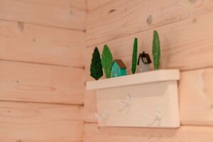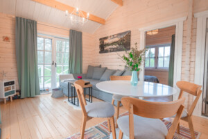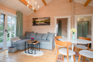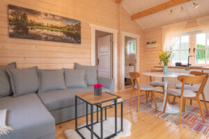 Tai pirmasis, kaimiško-skandinaviško stiliaus, mūsų pačių išplanuotas poilsio namelis. Pastatytas iš rąstų, apšiltintas, 30 kv.m. bendro ploto su 20 kv.m. dalinai dengta terasa. Namelyje rasite jaukų miegamąjį, patogią svetainę su virtuvėle ir valgomojo zona, bei tualeto su dušu patalpa. Virtuvėje yra visa reikalinga įranga, tad jausitės kaip namie. Nuo terasos atsiveria nuostabus vaizdas į tvenkinius, upelio senvagę ir upelio slėnį. Šis namelis šiltas ir puikiai tinkamas poilsiui net ir žiemą. „Gandro lizdas“ yra keturvietis namelis, su galimybe pristatyti papildomą lovą penktam svečiui, tad jis idealiai tinka poroms, šeimoms ar draugų bei kolegų kompanijoms.